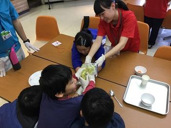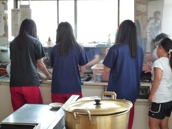 □予定では稲刈りと野菜の収穫でしたが、雨天で実施できなかったので、米と野菜の勉強や料理教室がありました。お米の話や野菜のクイズに、子どもたちが真剣に取り組んでいました。料理教室では、野菜を切る時にポイントを教えたりしながら、楽しく作ることができました。レク体操では子どもたちと一緒に楽しんで、私たちも必死になってゲームに取り組みました。子どもたちとふれ合えるこのような機会を大切にし、これからも積極的に取り組んでいきたいです。