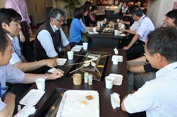 昼食をはさみ、蒲鉾本舗高政の女川本店「万石の里」を訪れました。ここでは工場見学と、かまぼこ手焼き体験をしました。また、東日本大震災の被災状況や震災後の取り組みについての話もうかがいました。