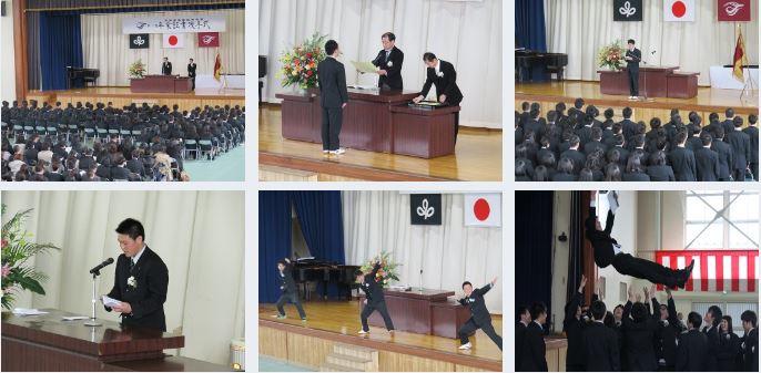 卒業式は、厳粛な雰囲気の中で整然と進行する中、3年間の思い出に涙する生徒・保護者の方々の姿が見られる感動的な素晴らしい式でした。終盤には、3年生の前生徒会長・副会長、そして応援団長がステージに駆け上がり『凱歌』斉唱を呼びかけると、卒業生・在校生が心を一つにして声高らかに歌い上げていました。