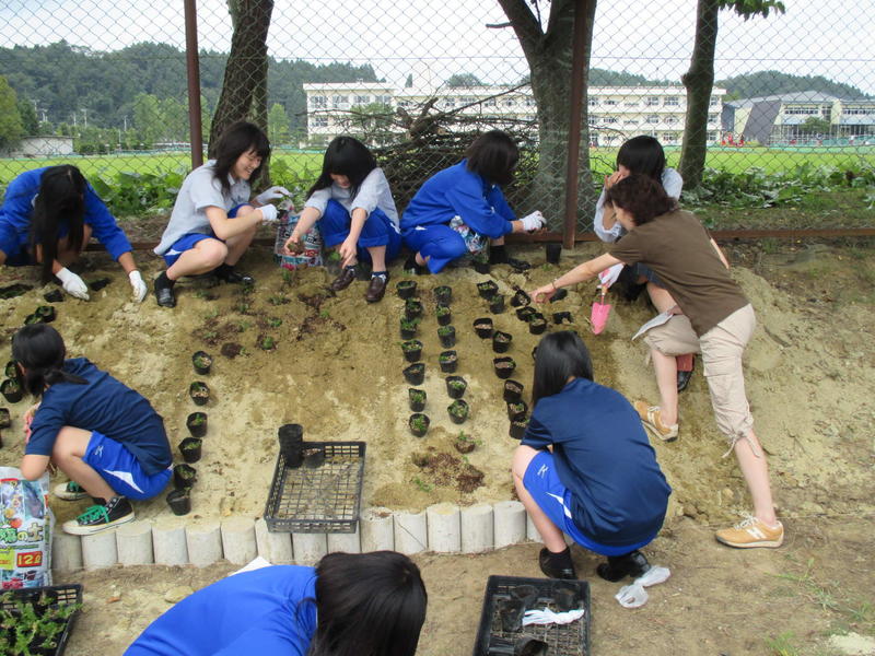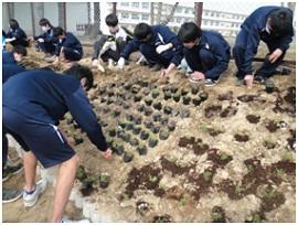 いよいよ築館高校で育った「第2世代芝桜」が広い花壇に根を伸ばす時がきました。 LHRの時間、2年生全員で、6月に挿し穂した芝桜の苗を花壇に移植しました。