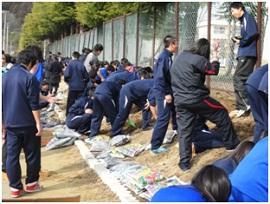 1年生が、芝桜の苗3,500株の植栽作業に取り組みました。2年生の生徒が植え方を教え、「元気のウェーブが巻き起こるように」との願いを込めて、昨年のデザイン同様、4色のウェーブ状に植えました。道行く方々の笑顔を想像しながら、終始楽しく作業を進めることができました。西門まであと一息。2年生の思いが1年生へとしっかり引き継がれ、植え終わった1年生の表情には達成感が感じられました。。