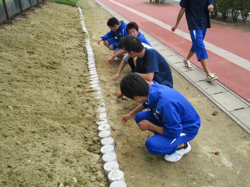 この日は全部で1,200ポットを縦2m横25mの範囲に植える作業と並行して除草作業も行いました。植栽作業は2回目なので、手際よく作業を進め、予定時間の1時間で作業を終了することができました。前日に陸上部の有志諸君が土壌作りの手伝いをしてくれたことも一因です。