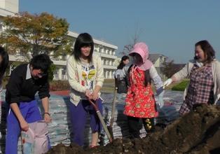 「2学年PTA学年行事」として,保護者の方々と2学年の職員、生徒が一緒に、「人のためプロジェクト」の一つである花壇への土入れ作業、芝桜の植栽作業を行いました。