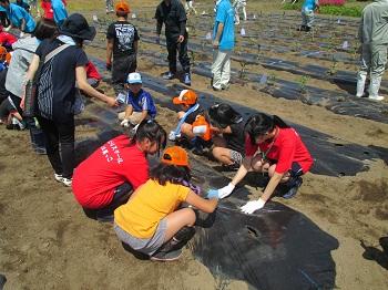 5月29日(日)に本校生徒2名が、小学生を対象に行われているJA栗っこ主催の「食農・食育体験~あぐりスクール~」にボランティアとして児童たちの活動補助に行ってきました。野菜の苗植えと田植えが行われました。次回は、10月に行われる稲刈り体験に参加します。