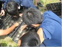 (ポットに土を入れ、さし穂をしました。最後に、遮光ネットの下に並べました。)
