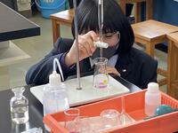 溶液が薄いピンク色になるのを目指し、ビュレットの操作に格闘する生徒たち。