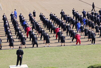 感染症予防のため長期間自粛してきた本格的な応援練習が今年度より復活し、定期戦に向けていよいよ熱を帯びてきました。校歌・3つの型のエール・凱歌など、特に1年生は全て覚えるのに苦戦してはいますが、4月27日(木)に定期戦を控え、全校生徒の一体感も日増しに高まってきています。4月20日(木)には、校庭での全校応援練習を実施しました。全校生徒が一堂に集う形での応援を久々に目にし、教員も大きな感動を覚えました。