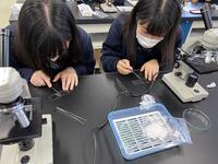 2年生の生物基礎で顕微鏡操作、ミクロメーター、タマネギの表皮観察と観察を重ねてきました。今までの観察の集大成となる、体細胞分裂の観察を行いました。染色した根を観察しやすいよう広げ、顕微鏡で細胞分裂している細胞を探しています。実験室に入る際は手指消毒、観察前後には消毒綿で顕微鏡を消毒しています。