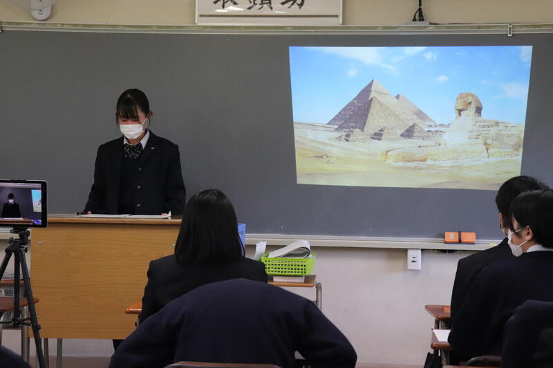19名(代表含む)の生徒が校長先生から賞状を授与されました。生徒はZoomで各クラスから拍手を送りました。その後、放送による校長先生のお話を聞き、校歌を各自心の中で歌いました。