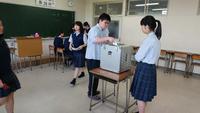 そして演説会終了後に投票が行われました。築高の生徒会役員選挙の投票は、演説会場や帰りのSHRの場で投票するような形ではなく、放課後、生徒が自主的に生徒手帳持参で投票所に行き、投票資格を確認した後、投票用紙を受け取り、借用してきた本物の投票箱を利用して投票する本格的な形を取っています。将来の有権者としての自分たちの姿がイメージできますね。さて投票の結果は