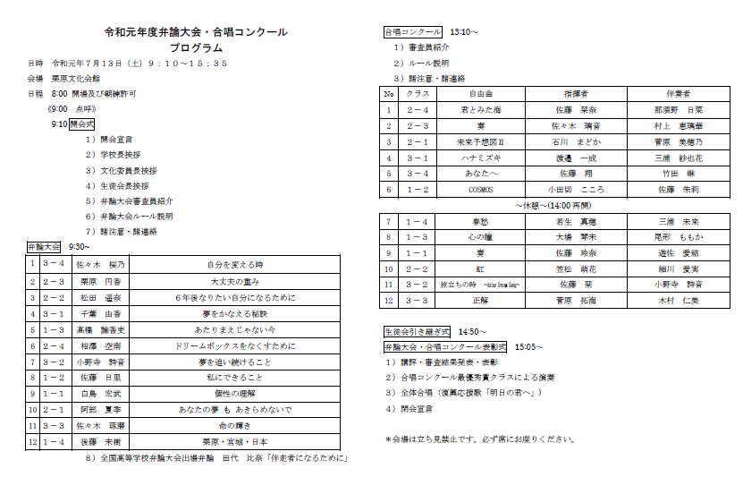 7月13日(土)に栗原文化会館を会場に令和元年度の長谷川杯争奪弁論大会・合唱コンクールが開催されました。 弁論はいずれも実体験に基づき論を組み立てていて自分を信じること・夢・食・日常を大切にすることなどをテーマにしたレベルの高いものでした。また合唱はクラスの団結力を発揮し、よく仕上げられたものでした。以下に結果と様子の写真を掲載します。