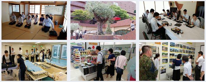 最後の陸上自衛隊多賀城駐屯地では、まず勤務や訓練の合間に、進んでジョギングをして体を自主的に鍛えているなどあまり目にすることのない自衛隊員の日常生活の姿を見ることができました。駐屯地内には食堂やコンビニ、雑貨店、理髪店、休憩所などがあり、この施設だけで日常生活に必要なほとんどのサービスがまかなえる様子です。見学者用にここでしか買えないお土産用のクッキーや瓶詰め食品なども売っていて、参加者を楽しませました。東日本大震災時の駐屯地自体の被災の様子や救助活動など、自衛隊員の実践での活動の様子を聞かせて頂くこともできました。