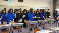 6月9日(土)にアメリカ、オクラホマ州より11名の高校生と2名のロータリークラブの方が築高に来校しました。本校生徒会による学校紹介プレゼンテーションを英語で行い,その後,折り紙や福笑いをして楽しみました。お昼は、料理研究部の生徒が唐揚げやたこ焼き、おにぎりなどを準備しました。生徒みんなでおにぎりをしながら、ランチタイムを楽しみました。午後は剣道体験を行い、日本の武道に触れていただきました。さまざまな活動を通して会話が弾み,築高生にとって,本物の英語に触れる良い機会となりました。