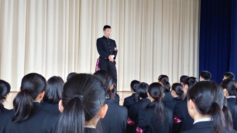 入学許可の後、三浦校長先生からは、「変化への適応」というキーワードを題材にした激励の言葉を頂き、つづいて新入生代表の川田澪さんが「これからは、お互いに協力し合い、常に思いやりをもって生活し自分で目標を掲げ、夢の実現のために精一杯努力します」と誓いの言葉を述べました。
