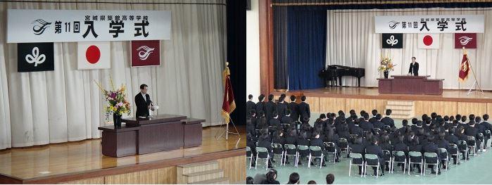 桜の花が咲き始めた4月8日(水)に本校体育館で第11回入学式が行われました。担任から名前を呼ばれると今後の高校生活への期待を込めた元気な声で返事をし、その後、佐々木壽徳校長から入学許可されました。校長式辞では、3年後なりたい自分に出会えるように主体的に日々を過ごしてもらいたいと、新入生に対する期待が述べられました。