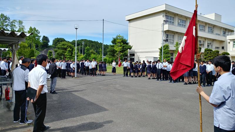 6月12日(水)7校時の時間帯を利用して今年度の第1回目の防災避難訓練が行われました。みやぎ県民防災の日に行われた今回の訓練は大規模な地震発生、停電を想定したもので、地震発生の連絡の後、各クラスで身体保護などの第一動作が一斉に行われ、続いて避難誘導担当教諭の口頭での指示で、避難場所への移動が速やかに行われました。