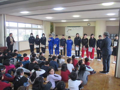 24日(火)は冬休み前の最後の授業日で、2時間の授業後、全校集会が行われました。全校集会に先立ち賞状伝達が行われ、以前にHPで紹介した陸上部の鵜澤くんや弁論全国大会出場が決定した相澤さんに加え、以下の生徒が全校生徒の前で表彰されました。