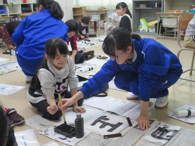 1月10日(金)宮野小学校で小学3年~6年生の児童に対して、書き初め展の書写指導を行いました。13名の生徒が、各学年に分かれて、書き初め展の課題の文字を、筆順や字形、毛筆のコツ等を教えてきました。一生懸命に書く小学生の姿に、高校生も笑顔で対応することができました。特に、将来小学校教員などを目指している人にとっては有意義な時間になりました。この続きは15日にも行われます。