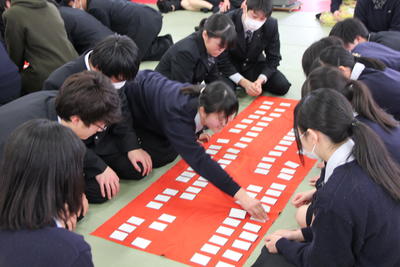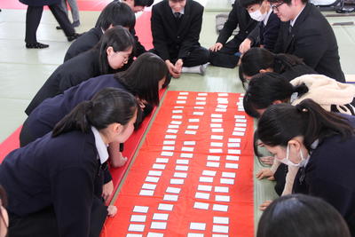 1月30日(木)3・4校時、2学年LHRで昨年度に引き続き学年で百人一首大会を行いました。実行委員が事前に準備を行ってくれたおかげで思い出に残る行事となりました。札の数も100枚に増えたことで難易度はあがりましたが練習から生徒たちが意欲的に取り組む姿が見られました。
