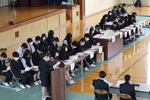 今年の春季生徒総会は、全校生徒が体育館に集まっての開催となりました。議題は、