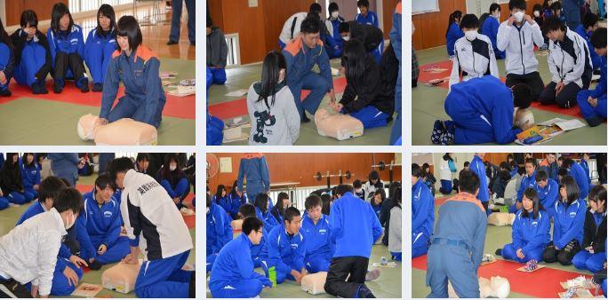 1月23日(月)・24日(火)栗原市消防本部から講師の先生を招き、1年生対象に普通救命講習会を実施しました。保健の授業でも取り上げられている応急手当・心肺蘇生法の正しい方法や手順・AEDの操作方法を学びました。消防隊員の方からは「意識を失った人が倒れていたり、けがで苦しんでいる人がいた場合、勇気を出して声をかけること、すばやい判断と対応がその人の命を助けることになる」とお話をいただきました。