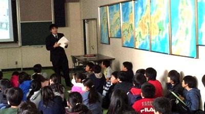 5年生を対象にプロジェクトの取り組みについて話しながら、環境問題について、町の活性化について一緒に考えました。真剣に聴いてくれる5年生の眼差しが印象的でした。