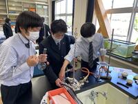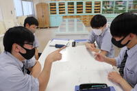 2年生の生物基礎で顕微鏡操作、ミクロメーター、タマネギの表皮観察と観察を重ねてきました。今までの観察の集大成となる、体細胞分裂の観察を行いました。染色した根を観察しやすいよう広げ、顕微鏡で細胞分裂している細胞を探しています。実験室に入る際は手指消毒、観察前後には消毒綿で顕微鏡を消毒しています。