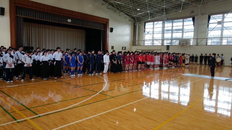 9日(木)に支部総体壮行式が行われました。選手入場後、まず白鳥会長から「3年生にとっては最後の大会となるので、1、2年生はサポートを十分に、3年生は悔いのないように楽しみながら定期戦の雪辱をしてください。応援の皆さんは(全員での)応援は今日しかできないので全力で頑張りましょう」という内容の挨拶があり、つづいて三浦校長から「練習の成果を十分に発揮してほしい。定期戦以上に大事な試合である。油断は禁物、流れを持ってきたら勝ちきること。不利でもあきらめずに粘り強く。地区総体でのいい結果と報告で私を元気づけてほしい」という趣旨の挨拶がありました。
