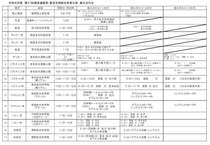 5月11日(土)、12日(日)を中心に行われる支部総体での築高各部の対戦相手が決定しました。下のPDFファイルのリンクをクリックするとはっきりとした組み合わせ一覧が見られますのでご活用ください。