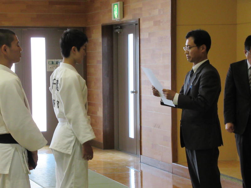 講話に先立って自転車マナーアップ指定証交付式が行われ、生徒を代表して指定証を受け取った白鳥生徒会長からは「築高生一同、交通ルールを守り、事故のない安全な生活を送ります」という力強い決意表明が行われました。