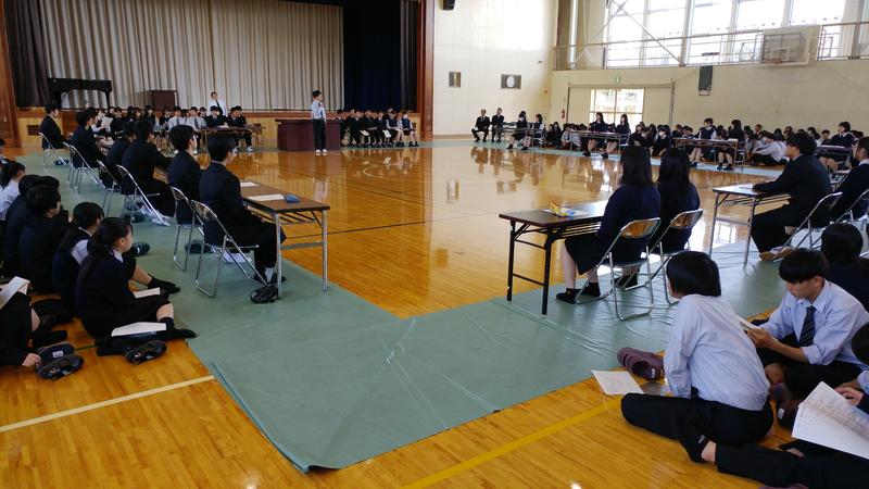 築館高校の生徒総会はまず座席の配置が特徴的。前にいる執行部に全生徒が向かい合う形ではなく、執行部、1年生、2年生、3年生が一辺のロの字を作る形で向かい合って着席します。議論しやすい雰囲気を作るためなのでしょうかね。