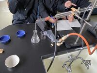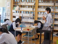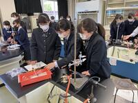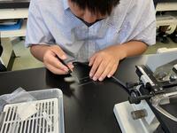 2年生の生物基礎で顕微鏡操作、ミクロメーター、タマネギの表皮観察と観察を重ねてきました。今までの観察の集大成となる、体細胞分裂の観察を行いました。染色した根を観察しやすいよう広げ、顕微鏡で細胞分裂している細胞を探しています。実験室に入る際は手指消毒、観察前後には消毒綿で顕微鏡を消毒しています。