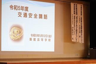 講話では,自転車事故の発生状況,自転車利用ルール等についての話に加え,4月から法律で努力義務化されたヘルメット着用とその必要生についてのお話もいただきました。また,防犯講話では,SNS上でのトラブル事例やその対処方法,薬物乱用防止に向けたお話を聴かせていただきました。