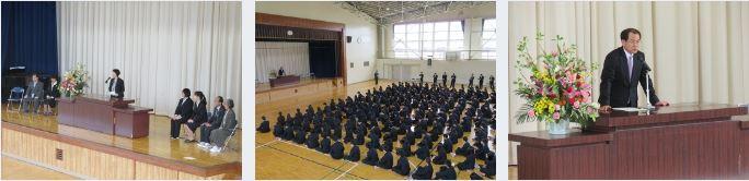 新任式では、人事異動により本校に着任した10名の先生方が紹介されました。続いて平成28年度始業式が行われ、佐々木壽德校長先生から生徒に向けて教育目標の詳しいお話と「今をひたむきに 今にひたむきに」のメッセージをいただきました。