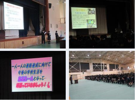 1学年からは、宮城県警察本部、築館保育所、東北電力、栗原中央病院を訪問した生徒が、2学年からは、東北労災看護専門学校、仙台ビューティーアート専門学校、仙台幼児保育専門学校、盛岡大学、宮城大学を訪問した生徒が発表しました。1学年はそれぞれの仕事のやりがいについて考え、2年生は実際に希望進路先の学校を訪問できたことで、今後の学習への動機づけが図られたようでした。また、自分が訪問していない学校や職場についても学ぶよい機会となりました。