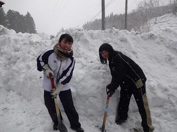 □最初、雪かきと聞いて少しあなどっていましたが、やってみて非常に重労働であると痛感しました。寝雪のために重く固く、氷のような雪をかいていくのはとても大変な仕事であるとわかり、お年寄りに は難しいと思いました。今回のボランティアを通して、将来私も地域社会のために何かやりたいという思いがさらに強くなりました。また、築高ボランティア部としての最後の活動だったので、思い出に残る活動でした。