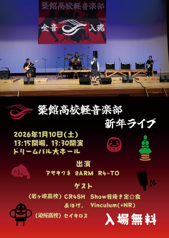 私たち軽音楽部は、むつみ会館二階に機材をそろえ練習しています。令和6年度より、自分達で運営するライブを定期的に行っています。次回は2026年1月10日にドリームパルで予定しています。岩ヶ崎高校、迫桜高校の軽音楽部もゲスト参加します。