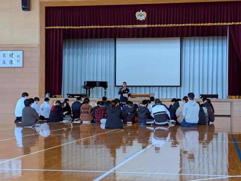 築館中学校を会場に、栗原警察署の方々に稽古をいただきました。一昨年にも実施しており、それがきっかけで警察官を目指した生徒がおりました。稽古後も子どもたちと接していただき、警察官になりたいと言っている小学生もいました。その後、令和8年4月かた道路交通法が改訂され、自転車にも罰則等が課せられるため講習会を開いていただきました。何も知らずに自転車に乗っていると怖い内容もあり、全員が真剣に受講していました。