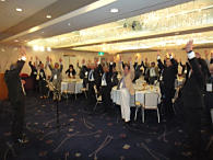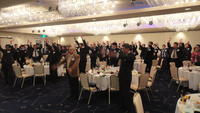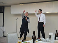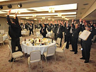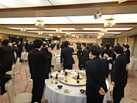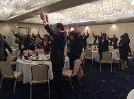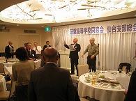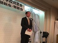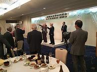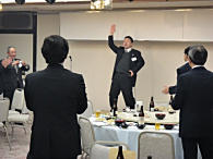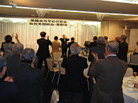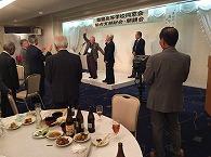 今年も多くの来賓の方のご参加をいただき、総会の部、懇親の部の二部構成で行われました。懇親会では来賓の方々や退職会員によるスピーチが行われました。また、元応援団長によるエール、校歌斉唱、凱歌により会場は大いに盛り上がり、力強い万歳三唱が会場いっぱいに響き渡りました。
