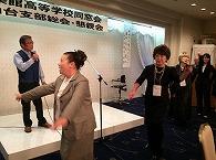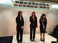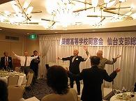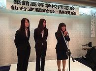 総会に引き続き、懇親会では、来賓の挨拶や退会者の紹介などが行われました。余興では、鈴木よね子さんによるマンドリン演奏と、築館高校1年生の髙橋祐仁くんによる現代舞踊が披露され、会場は大いに盛り上がりました。今年は出席者も大幅に増え63名が参加という大盛況の中、校歌斉唱・万歳三唱で締めくくられました。