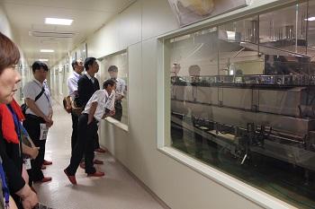 昼食をはさみ、蒲鉾本舗高政の女川本店「万石の里」を訪れました。ここでは工場見学と、かまぼこ手焼き体験をしました。また、東日本大震災の被災状況や震災後の取り組みについての話もうかがいました。